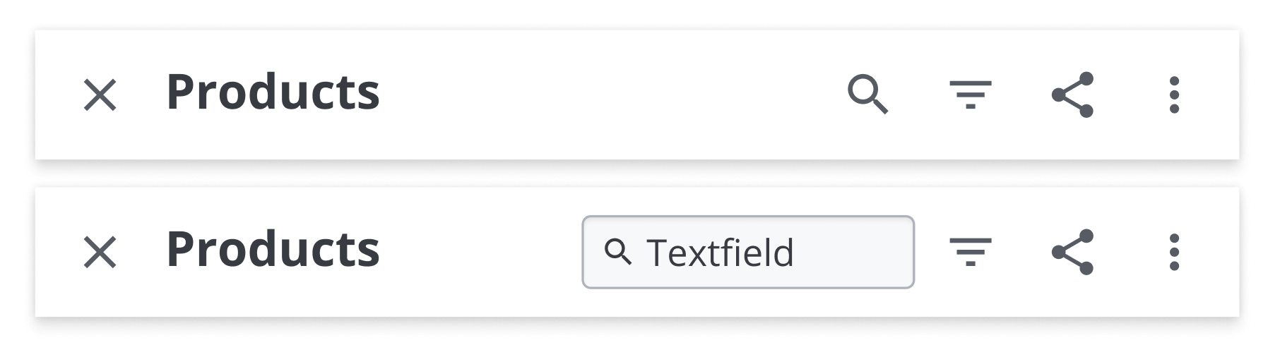 また、Trailingには検索クエリを入力して検索結果を表示できるTextfieldを配置できます。Textfieldは画面内における検索アクションの優先順位が高い場合及びデスクトップのように領域が十分ある場合はデフォルトで表示しますが、優先順位が低い場合はMagnifying GlassのIconのクリックイベントで展開します。