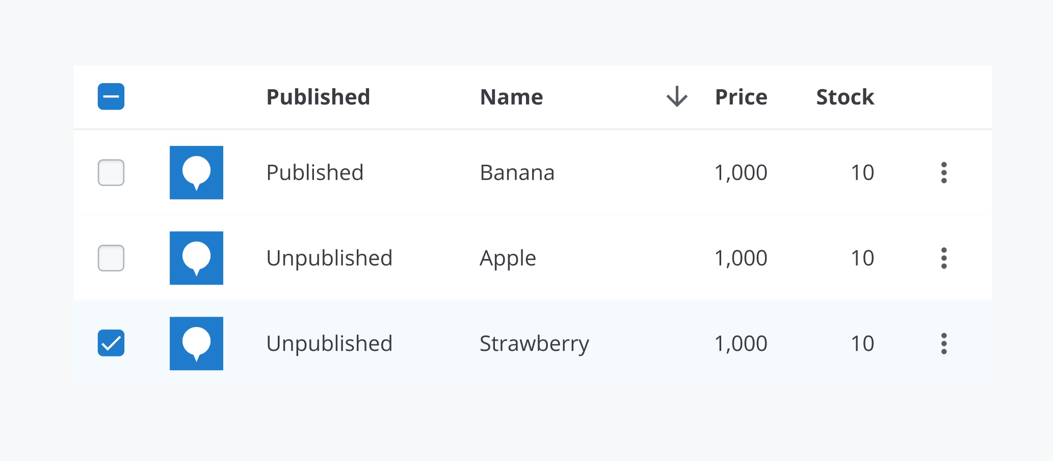 Checkboxを用いてオブジェクトの集合から対象のオブジェクトを複数選択することができます。Description側にSelectedとそうではないものが混在している場合、HeadingのCheckboxはmixedになります。