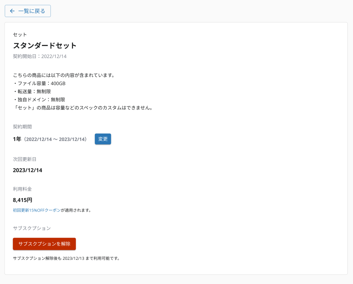 シングルビュー側に「契約期間の変更」「サブスクリプション解除」など低頻度・破壊的なアクションを配置することで、コレクションビュー側は行全体をクリックしてシングルビューへ遷移するアクションのみに絞り込むことができます。